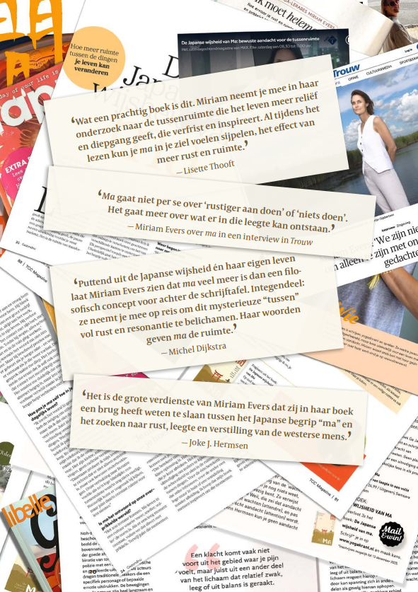 Miriam Evers ging op zoek naar ma. Ze reisde naar Japan en sprak met filosofen, kunstenaars en denkers als Erik Scherder, Joke J. Hermsen en Michel Dijkstra. Zo ontdekte ze hoe actueel deze oude Japanse wijsheid is.
